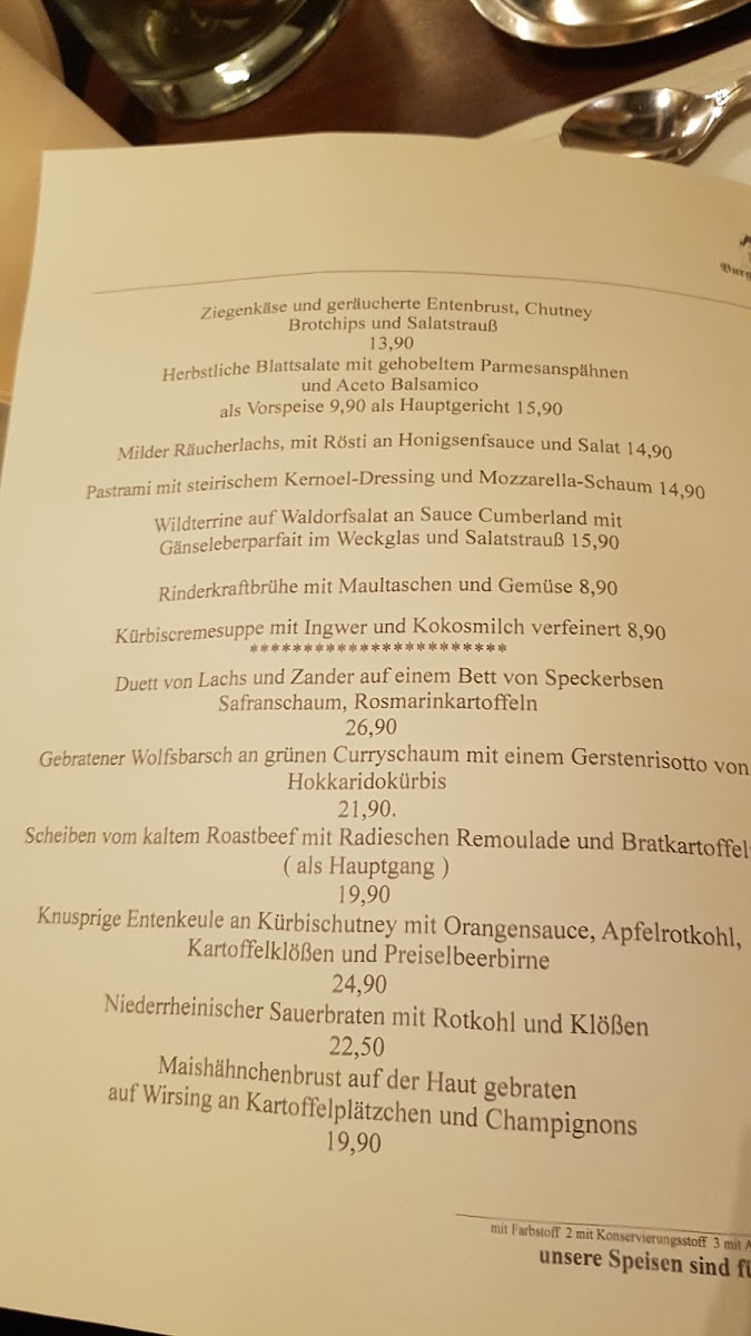 The menu also features rich meats like Schweinerücken Steak with a mustard crust and delicate preparations such as Wildbarsch auf Spinat mit Püree, offering both traditional and slightly adventurous choices. Seasonal touches, like Spargelpanna cotta or Kürbissuppe, add a gentle balance between familiar tastes and creative presentation.